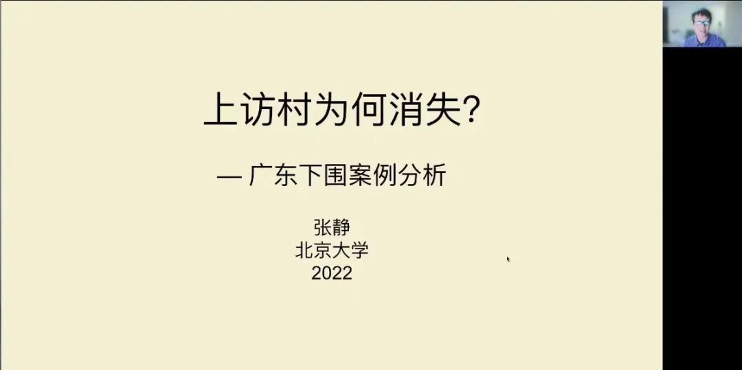 2022年12月27日,中山大学人文高等研究院逸仙进阶讲堂“中国乡村研究:组织、制度与伦理”第八讲通过线上形式开讲。北京大学张静教授线上主讲“公共规则与乡村社会治理:‘上访村’为何消失”,并与邓燕华教授、清华大学梅赐琪教授进行对谈。