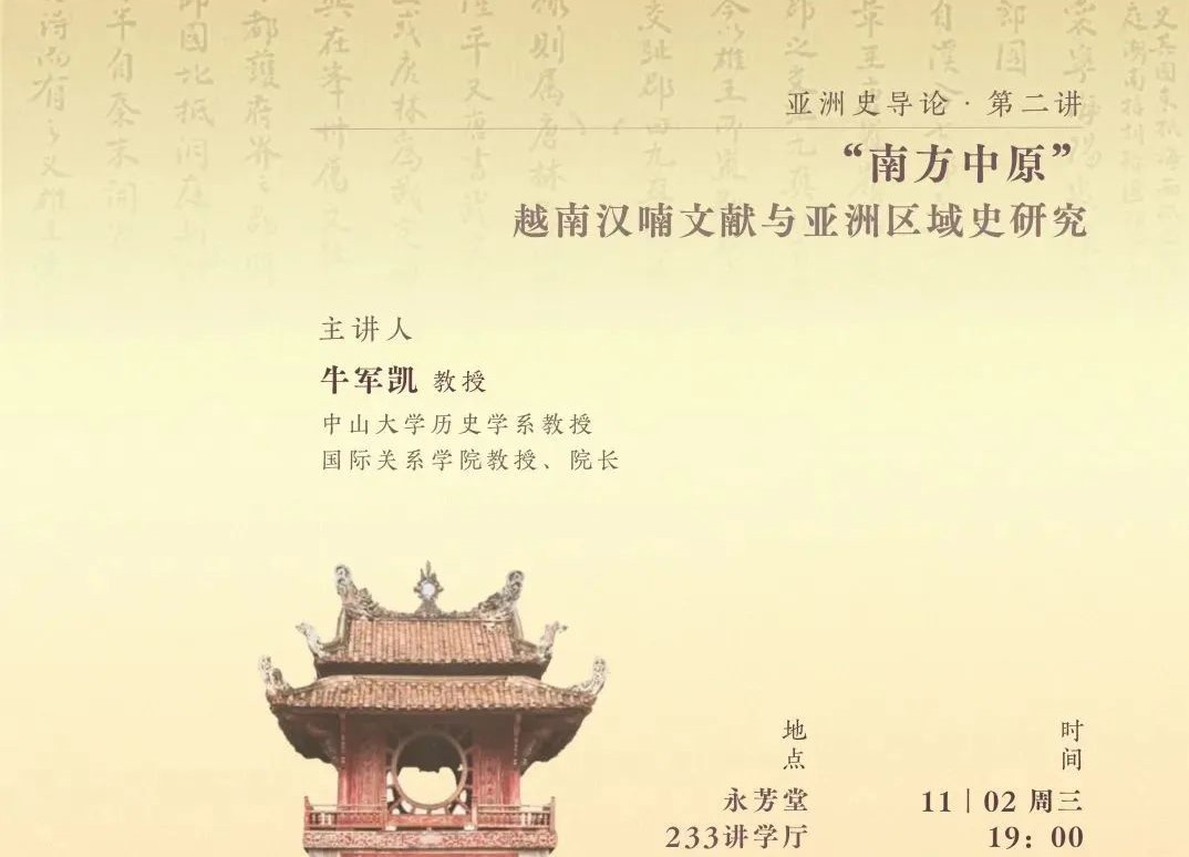 • 纪要·逸仙进阶讲堂 亚洲史导论 |【2】牛军凯:“南方中原”:越南汉喃文献与亚洲区域史研究 2022年10月26日晚上,中山大学人文高等研究院逸仙进阶讲堂系列课程之一“亚洲史导论”第二讲在中山大学南校园永芳堂233讲学厅举行,中山大学国际关系学院院长牛军凯教授通过线上授课的方式主讲“‘南方中... 2022-11-17