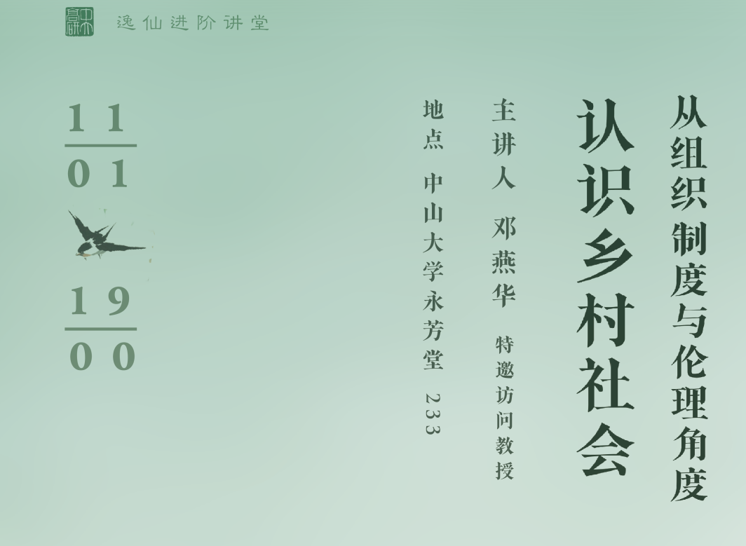 • 纪要·逸仙进阶讲堂 中国乡村研究:组织、制度与伦理 |【1】邓燕华:从组织、制度与伦理角度认识乡村社会 2022年11月1日,中山大学人文高等研究院逸仙进阶讲堂系列课程“中国乡村研究:组织、制度与伦理”第一讲在南校园永芳堂233讲学厅举行。中山大学人文高等研究院特邀访问教授邓燕华主讲“从组织、制度与伦理... 2022-11-15